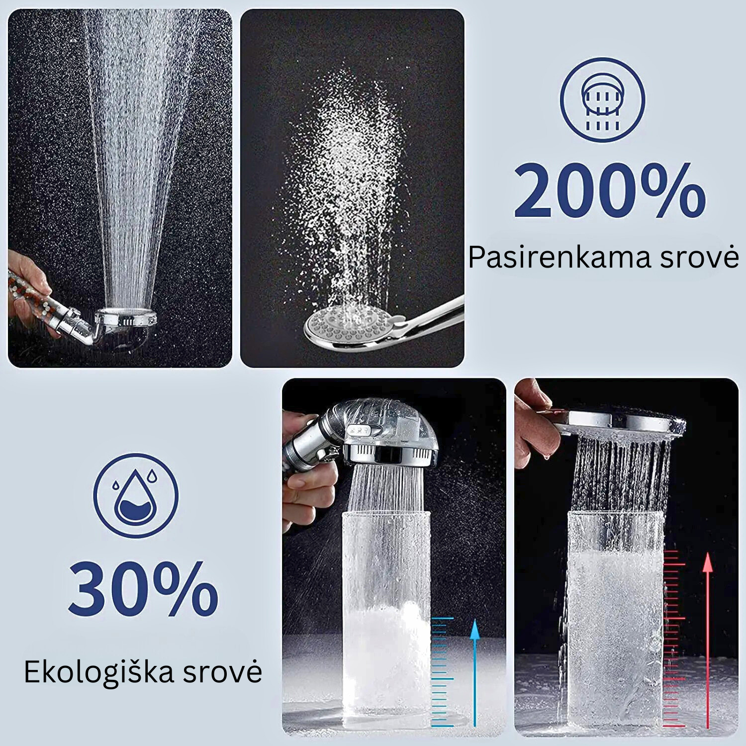 Aukšto slėgio technologija – mikro purkštukai padidina vandens srovės greitį ir stiprumą, taupant vandenį.