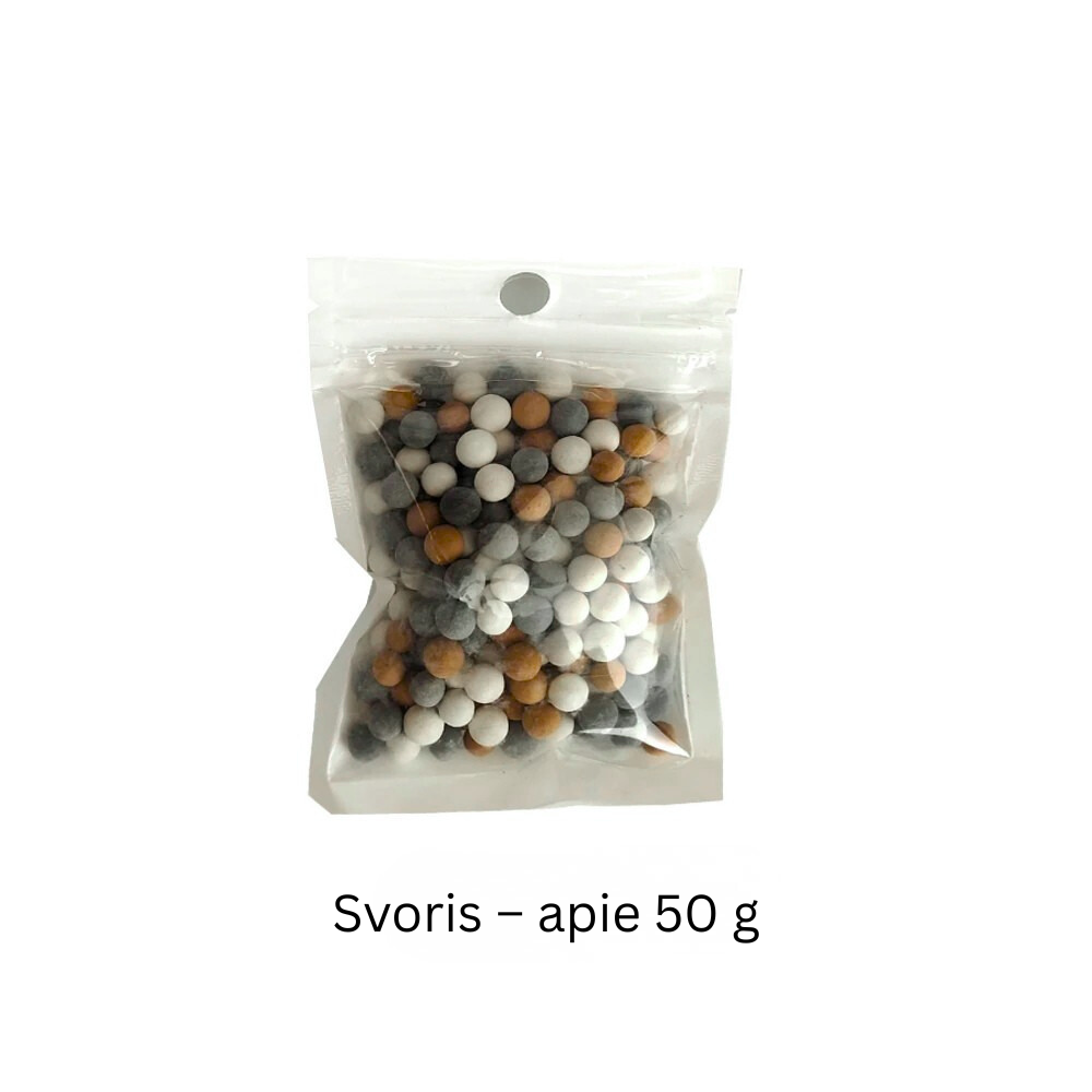 Filtravimo sistema – mineraliniai rutuliukai efektyviai pašalina vandens priemaišas, mažina chloro likučius, saugo odą ir plaukus.